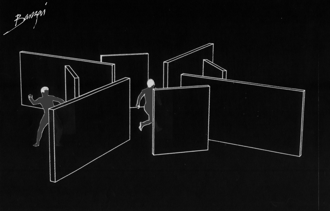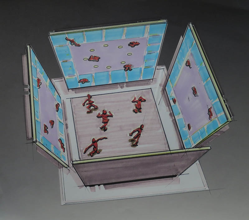 I thought of this as something that could be constructed in a public park. The eight sections would be concrete slabs. For smaller children it would function as a hide and seek structure, and for older children and adults it would be a court to play a version of dodgeball